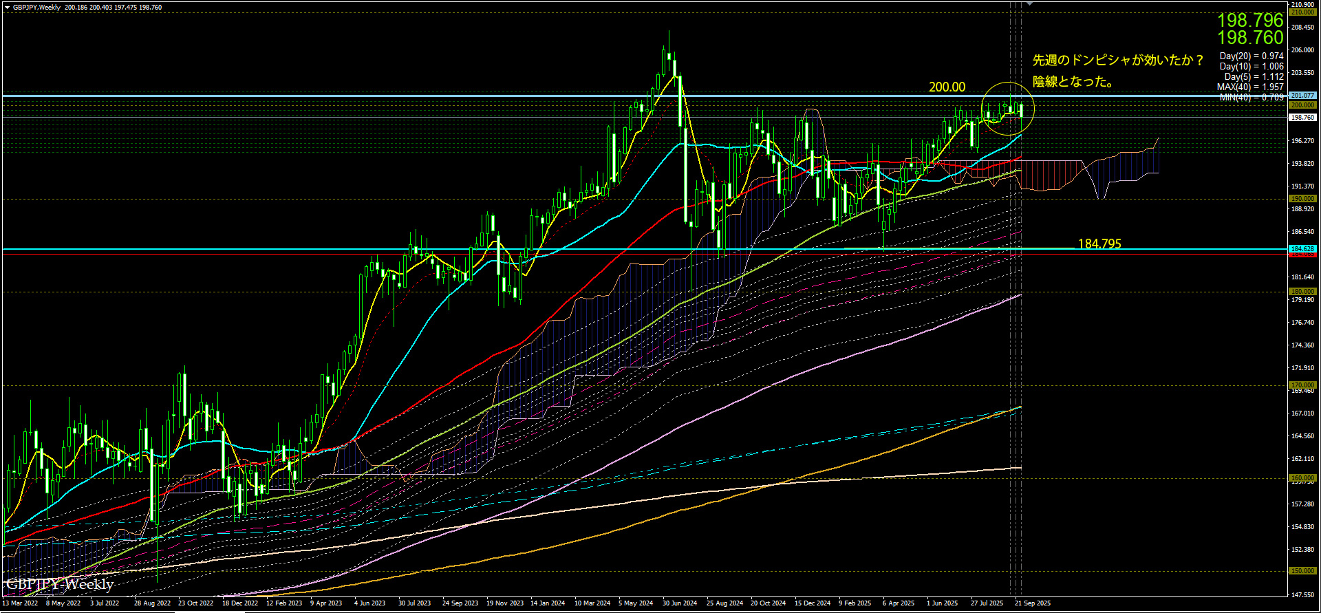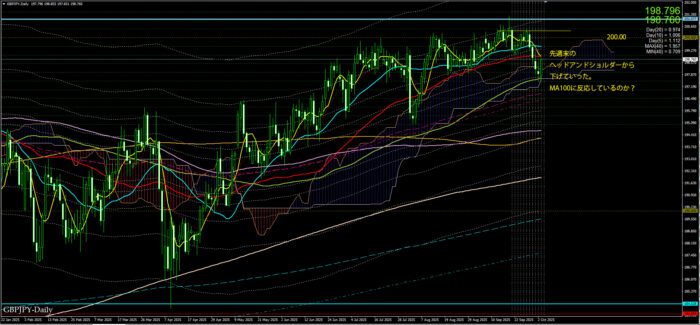 先週末の週足がドンピシャ、日足がヘッドアンドショルダーとなっていたが、週あけから下げていった。
