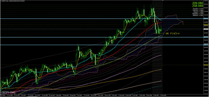 先週の大きな下げの後のもみ合いで方向がみえなかった。しかし日足ではドンピシャが出ており(A)、若干上方向への勢いがあったか?