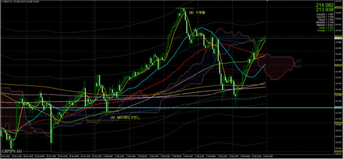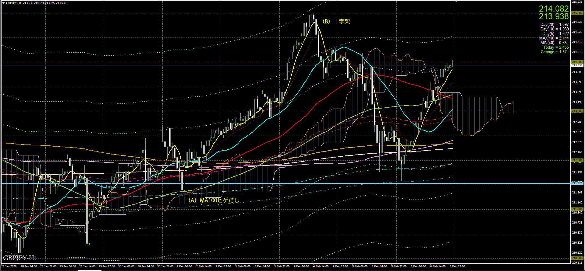 1時間足をみると、(A)はMA100ヒゲだし。(B)は十字架。