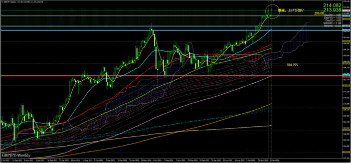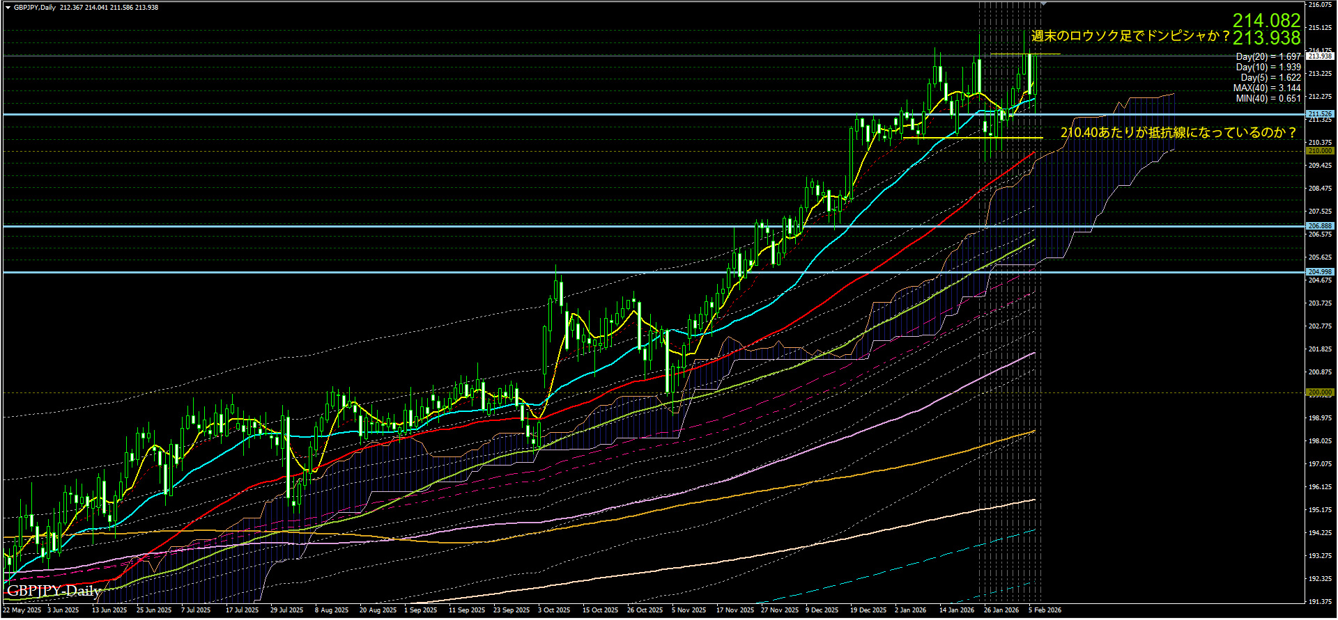 上げの勢いが強い。週の前半上げたが、2/4-2/5と下げた。しかし週末2/6再び上げに。