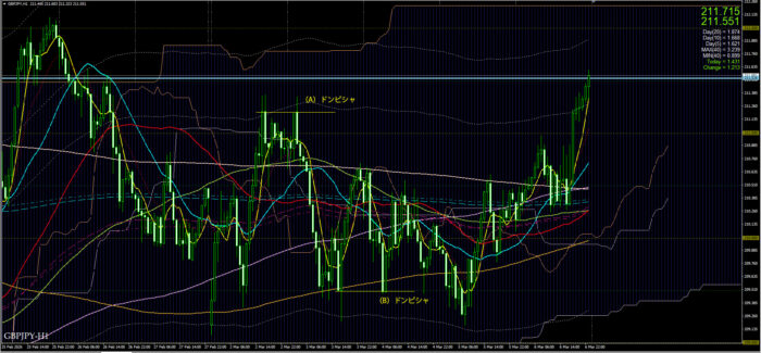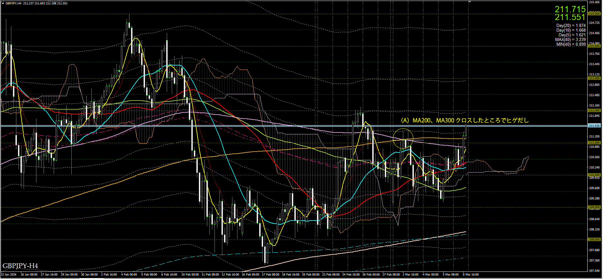 4時間足をみると、(A)MA200、MA300 クロスしたところでヒゲだし