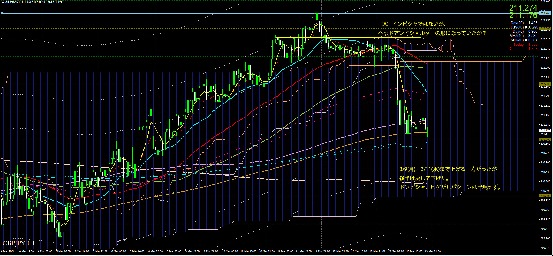 1時間足をみると、ドンピシャ、ヒゲだしパターンは現れなかったが、(A)ドンピシャではないが、ヘッドアンドショルダーの形になっていたか?